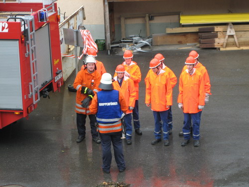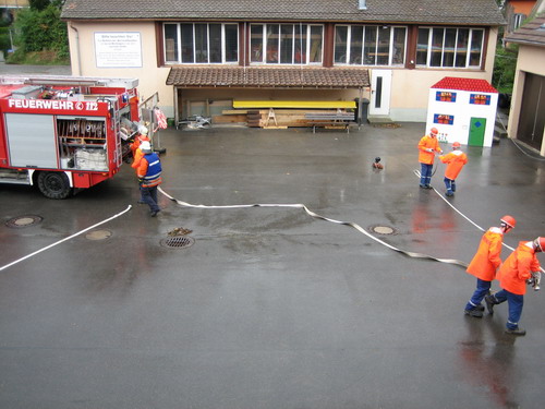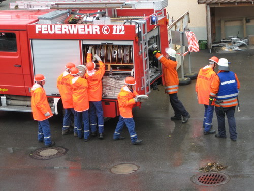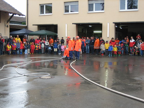 Als besonderes Highlight des Tages, wurde durch die im letzten Jahr gegründete Jugendfeuerwehr, unter Leitung von Stellv. Jugendfeuerwehrwart Alexander Peters, ein Übungseinsatz demonstriert. Die Alarmierung wurde, wie bei einem richtigen Einsatz, über Meldempfänger durch die Integrierte Leitstelle des Landkreises Konstanz durchgeführt. "Brand Gebäude in der Häfelishofstr. 5, vermutlich noch Personen im Gebäude" so der Funkspruch der Leitstelle. Bei dem brennenden Gebäude handelte es sich allerdings nur um eine Häuserattrappe mit Klappfenstern mit aufgemalten Flammen. Die Jugendfeuerwehr war mit vollem Einsatz dabei, so, als ob es sich um einen realen Einsatz handelte.