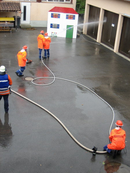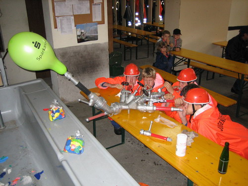 An weiteren Stationen konnten die Kinder sich mal als Feuerwehrmann/frau fühlen, Löscheinsatz an der Häuserattrappe mit D-Schläuchen, Schläuche aufrollen mit der Schlauchwickelmaschine und am Löschwasserverteiler zu dritt gemeinsam einen Luftballon aufzublasen bis er platzt.