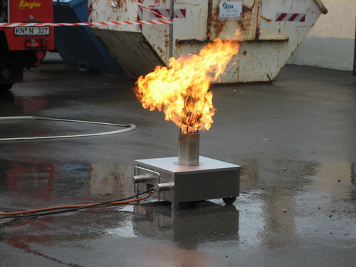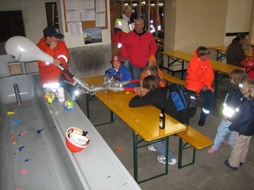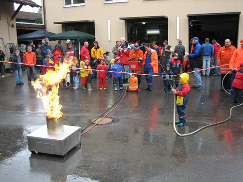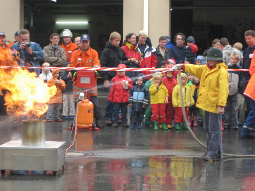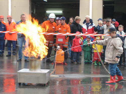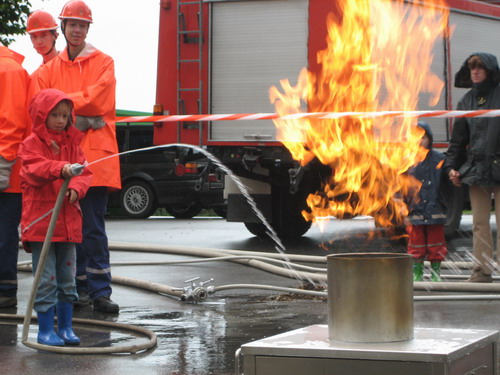Neu in diesem Jahr war ein sogenannter Löschtrainer, eine mit Gas und auf Knopfdruck anzündbare Brandstelle. Hier wurde den Anwesenden eindrucksvoll demonstriert, welche Gefahr von handelsüblichen Spraydosen ausgeht. Eine fast leere Deospraydose wurde in einem Käfig im Löschtrainer erhitzt und explodierte schon nach wenigen Augenblicken mit lautem Knall und Stichflamme vor den Augen der Zuschauer. Der Löschtrainer kann für viele Szenarien von Brandherden umgebaut werden, so konnten die Kinder im Anschluß einen Mülleimerbrand zu löschen versuchen. Die Kinder waren immer im Zweierteam im "Einsatz", ein Kind am Strahlrohr zum Löschen und das andere an der Kübelspritze zum Pumpen, schnell bildete sich eine lange Warteschlange. In diesem Zusammenhang wurde auch nochmals darauf hingewiesen, eine brennenden Pfanne oder Friteuse auf dem Herd auf gar keinen Fall mit Wasser zu löschen. Als beste Möglichkeit das Feuer zu löschen, kann ein Topfdeckel dienen um das Feuer zu ersticken. Die Miete des Löschtrainers wurde finanziert durch die SV Sparkassen-Versicherung, vertreten durch die Agentur Bernfried Koch, herzlichen Dank hierfür.