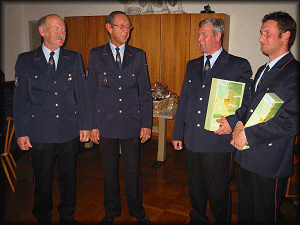 Bernhard Graf (zweiter v. rechts) scheidet aus dem Feuerwehrausschuß aus und erhält ein Weinpräsent Thomas Huber (rechts) erhält für 10-Jahre bei der FFR ein Weinpräsent Bild: FFR