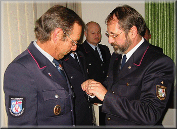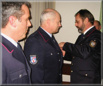 Bevor Kreisbrandmeister (KBM) Rolf-Jürgen Stoffel die Ehrungen für 25 und 40 Jahre Feuerwehrdienst vornahm, nutzte er die Gelegenheit allen FW-Angehörigen zu danken für die vielen Stunden, in denen man ehrenamtlich bei der Feuerwehr und nicht zu Hause bei der Familie ist. Die durchgeführte Ausbildung in einem Brandübungscontainer bezeichnete er als eine "hervorragende Geschichte" vor allem "für Atemschutzträger, die das Feuer noch nie so gesehen haben". So wurde Otto Allweiler, Walafried Beck, Richard Honsell und Peter Kude mit dem Feuerwehr-Ehrenzeichen des Landes Baden-Württemberg in Silber für 25 Jahre und Günter Jörg mit dem Ehrenzeichen in Gold 40 Jahre aktiven Feuerwehrdienst geehrt. Die Glückwünsche und Dankesworte der Gemeinde überbrachte Bürgermeister Volker Steffens mit der Reichenauer Wappenscheibe als Auszeichnung.
