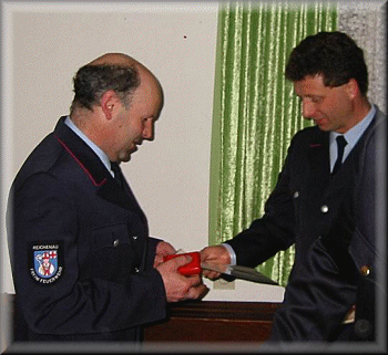 Bürgermeister Volker Steffens durfte zwei Beförderungen aussprechen, Bernfried Streibert wurde zum Feuerwehrmann und Kdt. Andreas Schlegel wurde nach erfolgreich absolvierten Zugführerlehrgang in Bruchsal zum Brandmeister befördert.
