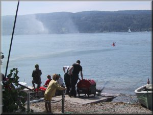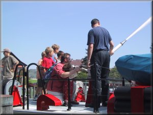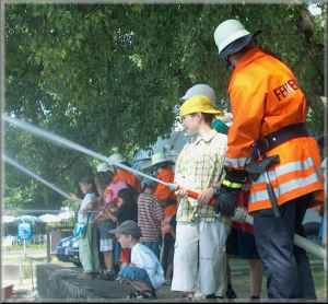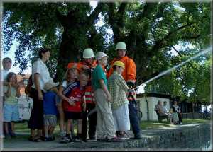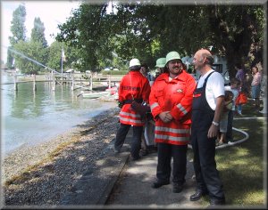 Danach wurden alle Kinder mit den beiden Löschfahrzeugen zum "Einsatzort" an der Schiffslände gefahren. Besonders aufregend war für die Kinder natürlich, daß mit Blaulicht und Martinshorn gefahren wurde. Am "Einsatzort" hatten die Kinder dann an mehreren Stationen die Möglichkeit selber einmal Feuerwehr- mann zu sein. Als Einleitung zeigten die Kameraden der Reichenauer Feuerwehr einen Löschangriff als Schauübung. Das Feuerlöschboot des Landkreises "LBD Heinz Schäfer" war hierbei die Hauptattraktion. Auf dem Feuerlöschboot konnten die Kinder die Löschkanone bedienen, betreut von unseren Kameraden der Feuerwehr Konstanz.