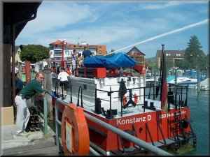 Die Hauptattraktion, das Feuerlöschboot "LBD Heinz Schäfer". Hier konnten die Kinder die Löschkanone testen und Ihre Neugier befriedigen. Die Kameraden der Feuerwehr Konstanz beantworteten die unzähligen Fragen, hierbei nochmals unser herzliches Dankeschön. |