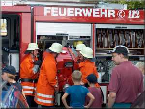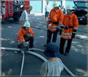 Dichtes Gedränge an den Rohren, nur Geduld es kommen alle dran, hier am C-Rohr. Wasser war und ist schon immer etwas Faszinierendes für Jung und Alt. Im Hintergrund der Wassertrupp (Sebastian Böhler und Karl Geisert) beim Einsatz mit den Kleinen am B-Rohr.