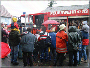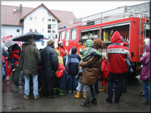 Bei strömendem Regen fanden sich um die 50 Kinder mit Ihren Eltern im Gerätehaus auf der Insel Reichenau ein, um allerlei über die Feuerwehrarbeit zu erfahren und zu erleben. Nach einer kurzen Begrüßung und Einführung durch Kommandant Karl Huber konnten die Anwesenden die beiden Löschfahrzeuge genau unter die Lupe nehmen. Karl Huber und Thomas Baumgartner erklärten die verschiedenen Ausrüstungsgegenstände, die auf einem Löschfahrzeug mitgeführt werden.
