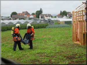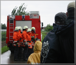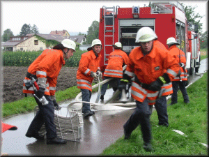 Der Wassertrupp Rene Baumüller und Alex Peters legen die Wasserversorgung, der Schlauchtrupp Simon Wohlhüter und Thorsten Marte legen die Löschleitungen, Melder Josef Blum überwacht den Verteiler und Maschinist Johannes Deggelmann hat die Feuerlöschpumpe voll im Griff.....