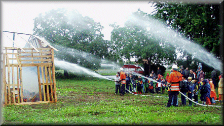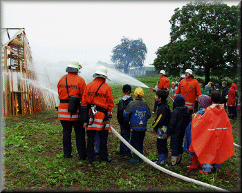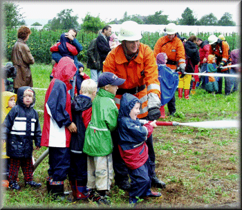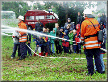 Wasser Marsch aus allen Rohren, eine feuchte aber für die Kleinen doch spaßige Angelegenheit. Gruppenführer Baumgartner leitet die Löscharbeiten.