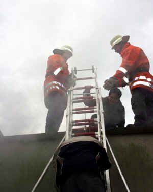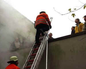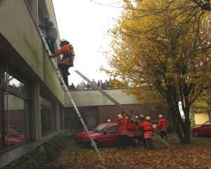Von Oben sicherten zwei Feuerwehrmänner und führten die Schüler sicher zur Leiter, wo dann jeder von einem Kameraden der Wehr bis zum Boden geleitet wurde