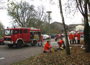 Die letzte Feuerwehrübung in der Schule liegt ungefähr zehn Jahre zurück. So daß es für die Schüler die erste große Feuerwehr-Übung war. Nach kurzer Zeit traf die Feuerwehr Reichenau mit Ihren beiden Löschfahrzeugen LF 16 und LF 8/6 und Ihrem Mannschafts- transportwagen mit ca. 22 Mann an der Schule ein. Sofort arbeiteten sich zwei Trupps mit schwerem Atemschutz in das Innere der Schule zur Menschenrettung und Brandbe- kämpfung vor. Zwei weitere Trupps machten sich an die Durch- suchung aller Klassenräume nach Verletzten auf. Innerhalb kurzer Zeit konnte Feuer "schwarz" gemeldet werden und die Schule war vollständig nach Verletzten durchsucht. Da