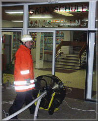 Zugführer Edi Böhler überwacht die Lüftung des Gebäudes mittels wasserbetriebenem Hochleistungslüfter... |
