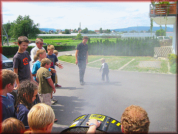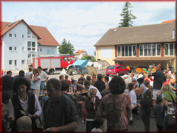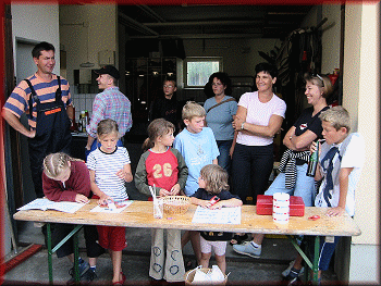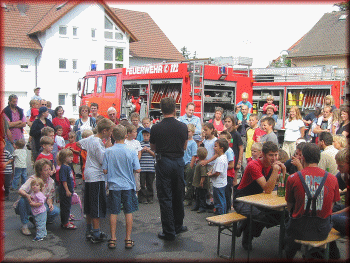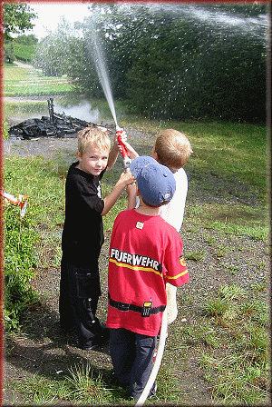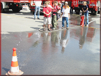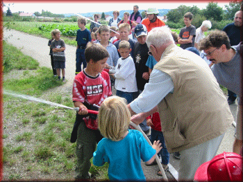 Mit etwa 70 jungen Teilnehmern hatte die Feuerwehr bei ihrem Kinderaktionstag gerechnet. Da es dann doch einige mehr und auch viele Eltern mitgekommen waren, musste zwischendurch noch eine Ladung Bratwürste zusätzlich herangeschafft werden, damit auch alle nach dem Einsatz zu ihrem Imbiss beim Geräte haus kamen. Dort baute die Feuerwehr noch ein Geschicklichkeitsspiel auf, bei dem man mit der Kübelspritze einen Ball