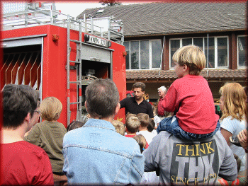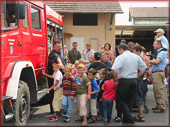 Mit zwei Löschfahrzeugen und einem Mannschaftstransporter brachten die Wehrleute die vielen Kinder zum Brandort. Da waren einige Einsatzfahrten - natürlich mit Blaulicht und Martinshorn - nötig, bis alle am Maurerparkplatz waren.