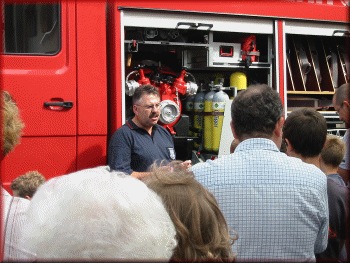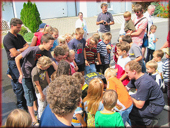Die Kinder hören aufmerksam zu, was Kommandant Schlegel über die Arbeit bei der Feuerwehr berichtet.