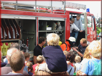 treffen musste. Und dann führte die Wehr noch vor, was für einen starken Luftzug ihr Lüftungsgerät verursachen kann. Das war eine große Gaudi für die Kinder, die sich lachend in den künstlichen Wind stellten. In Wirklichkeit dient der Lüfter natürlich dazu, den Rauch aus einem Haus, in dem es gebrannt hat, herauszublasen.