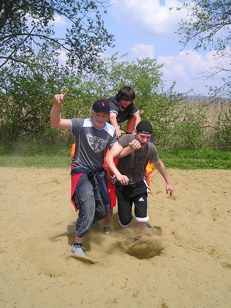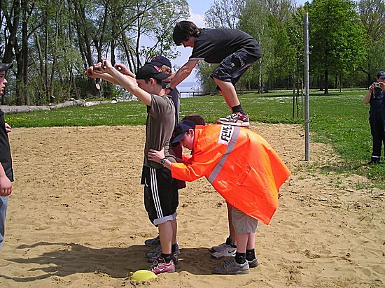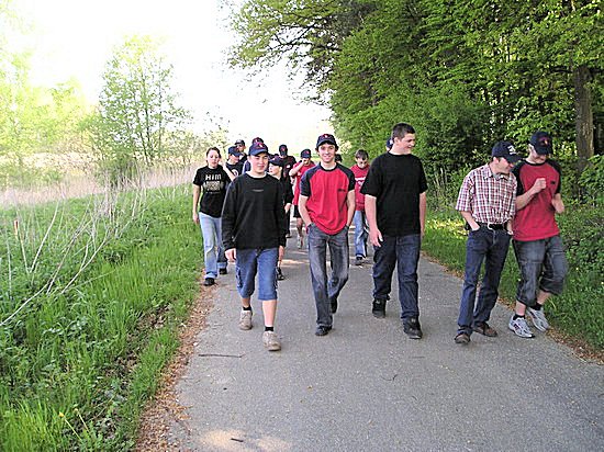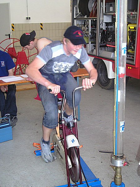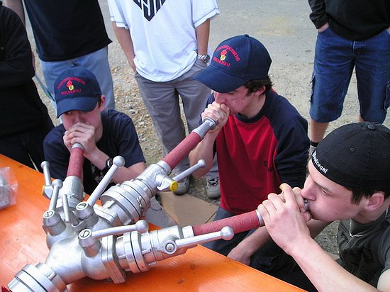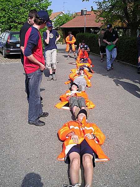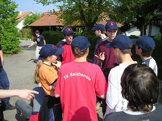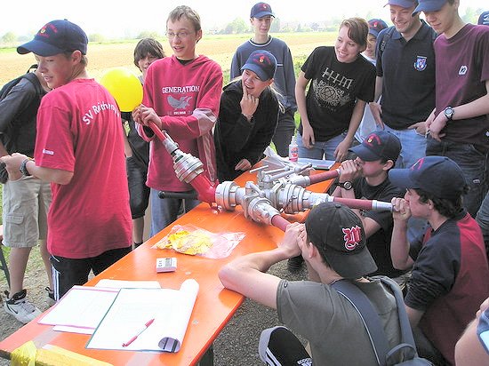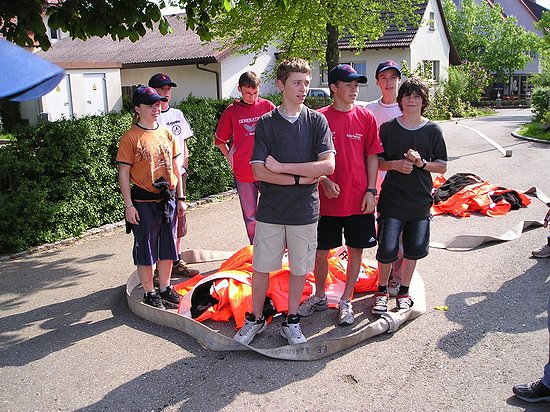 Auf der Wegstrecke von knapp 10 Km mußten markante Punkte im Mooser Ortsgebiet, wie z. B. die Mooser Joppen oder ein Fischer auf einer Hauswand erkannt und dokumentiert werden. Hierzu mußten immer wieder Einwohner befragt werden, um die ortsbezogenen Fragen zu beantworten. Außerdem konnten die Jugendlichen an 9 Stationen im Gemeindegebiet verteilt, Ihr Wissen und Ihre Geschicklichkeit unter Beweis stellen. So mußten an einer Station Luftballons aufgeblasen werden, allerdings von drei Teilnehmern über drei Strahlrohre verbunden mit einem Feuerwehrverteiler. Aber auch Tretboot fahren, Fische erraten, Tierspuren lesen, Pumpe antreiben und eine Löschwasserkette standen auf dem Programm. Im Bürgerhaus in Moos wurde zur Stärkung das gemeinsame Mittagessen gereicht.
